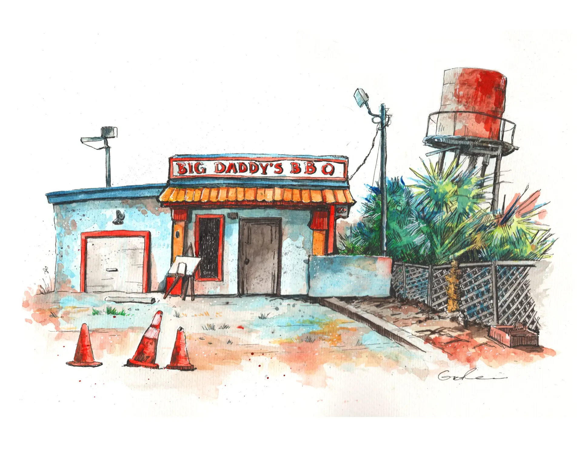 Weathering through the storms, Florida buildings can’t be judged from the outside. Signed 9×12 original.